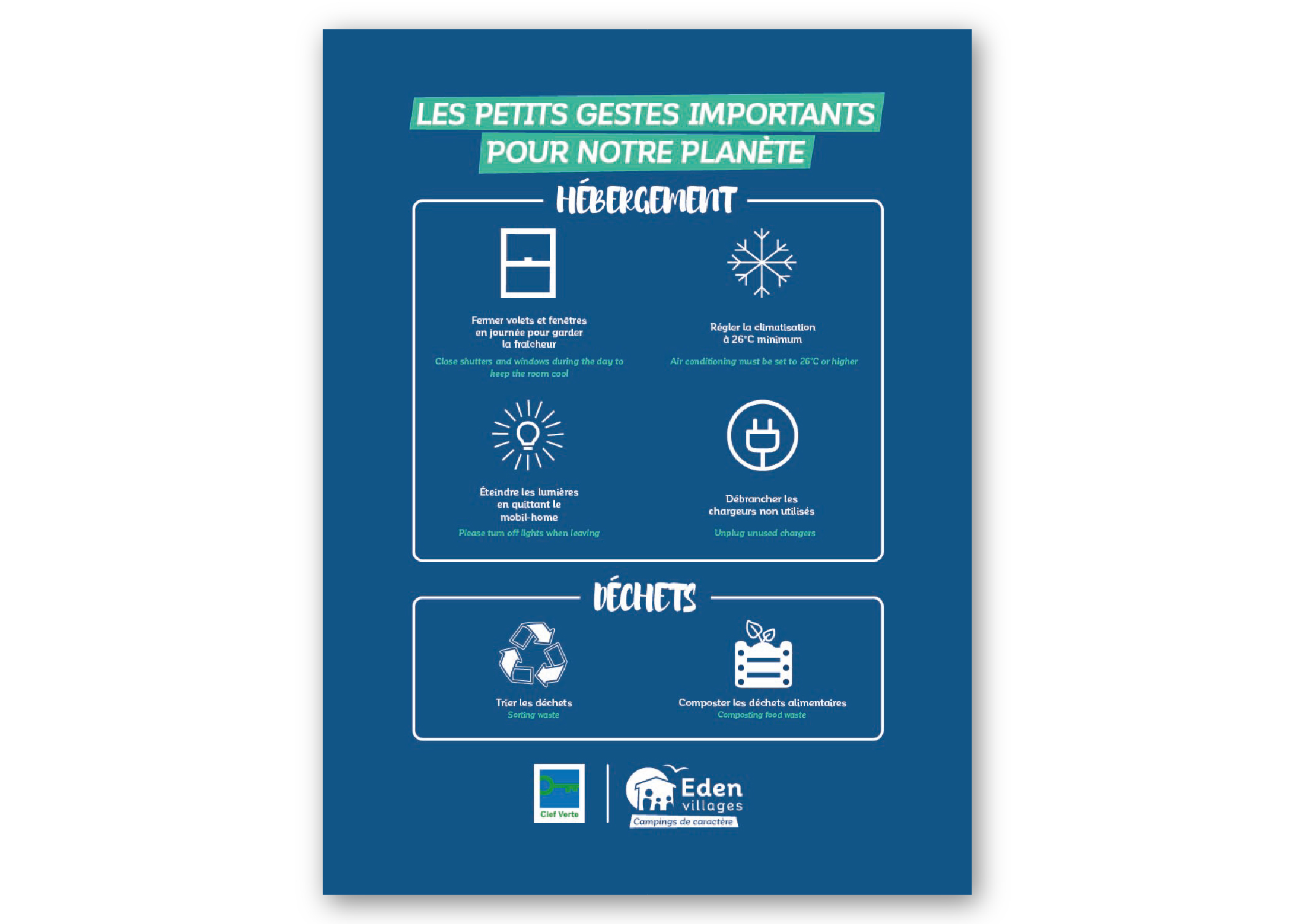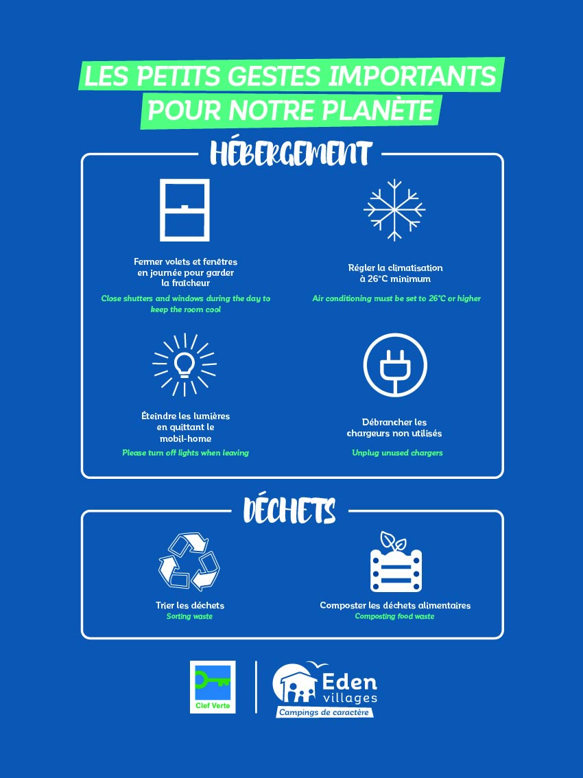 Panneau « les petits gestes importants pour notre planète » hébergement et déchets, rappelle les bons réflexes pour économiser l’énergie et à trier les déchets.