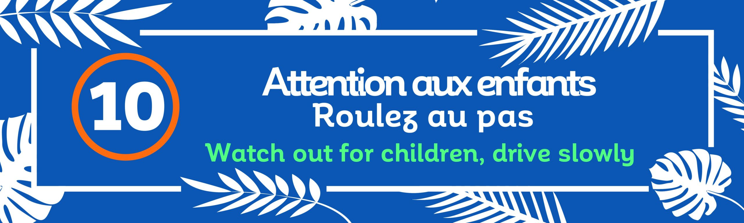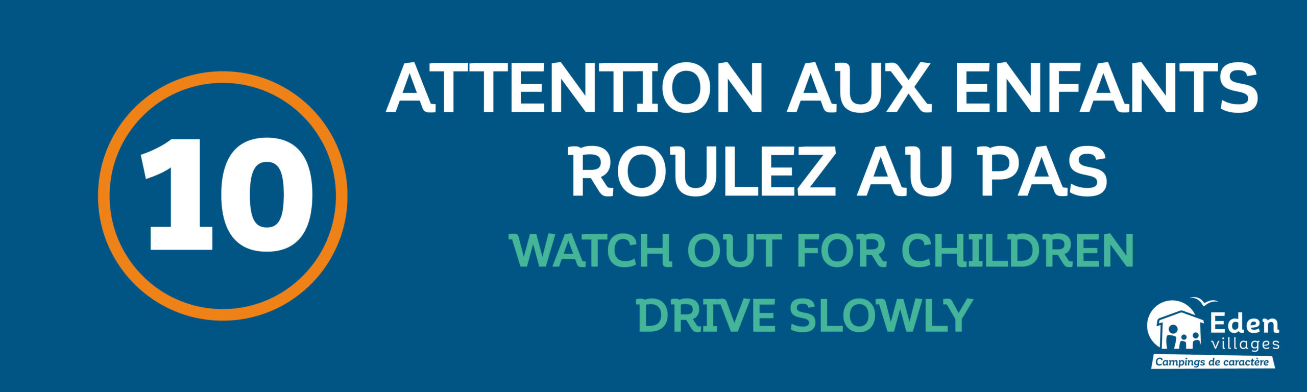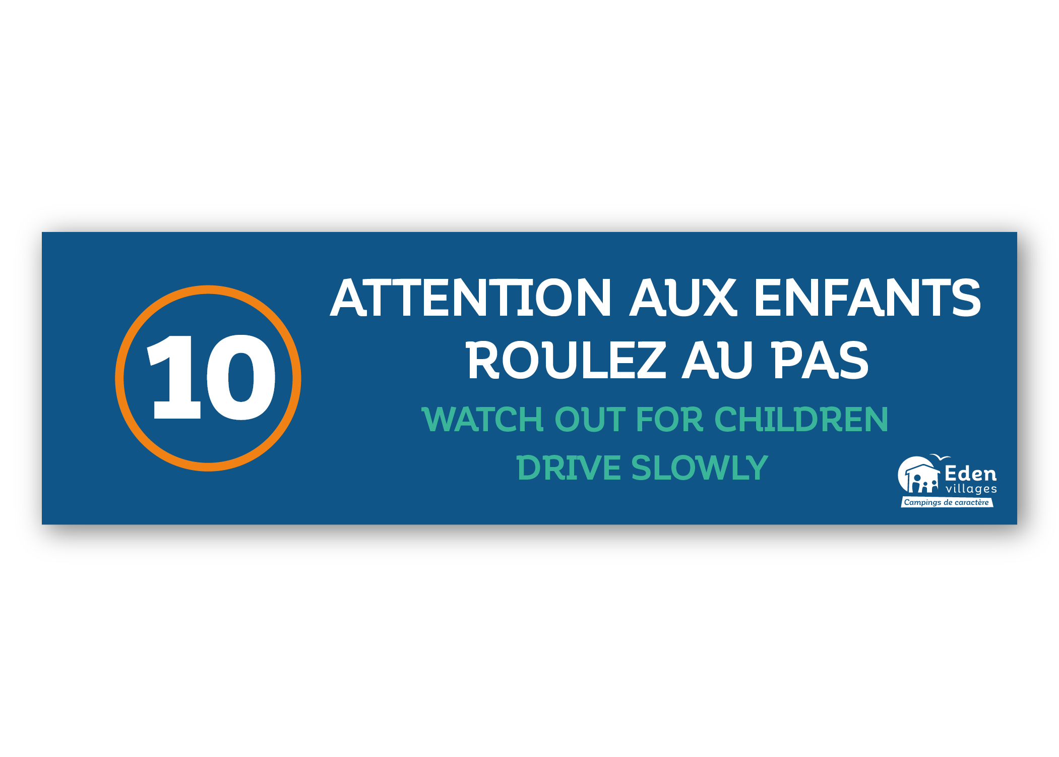 Panneau « Attention aux enfants, Roulez au pas » avec une limitation de vitesse à 10 km/h.