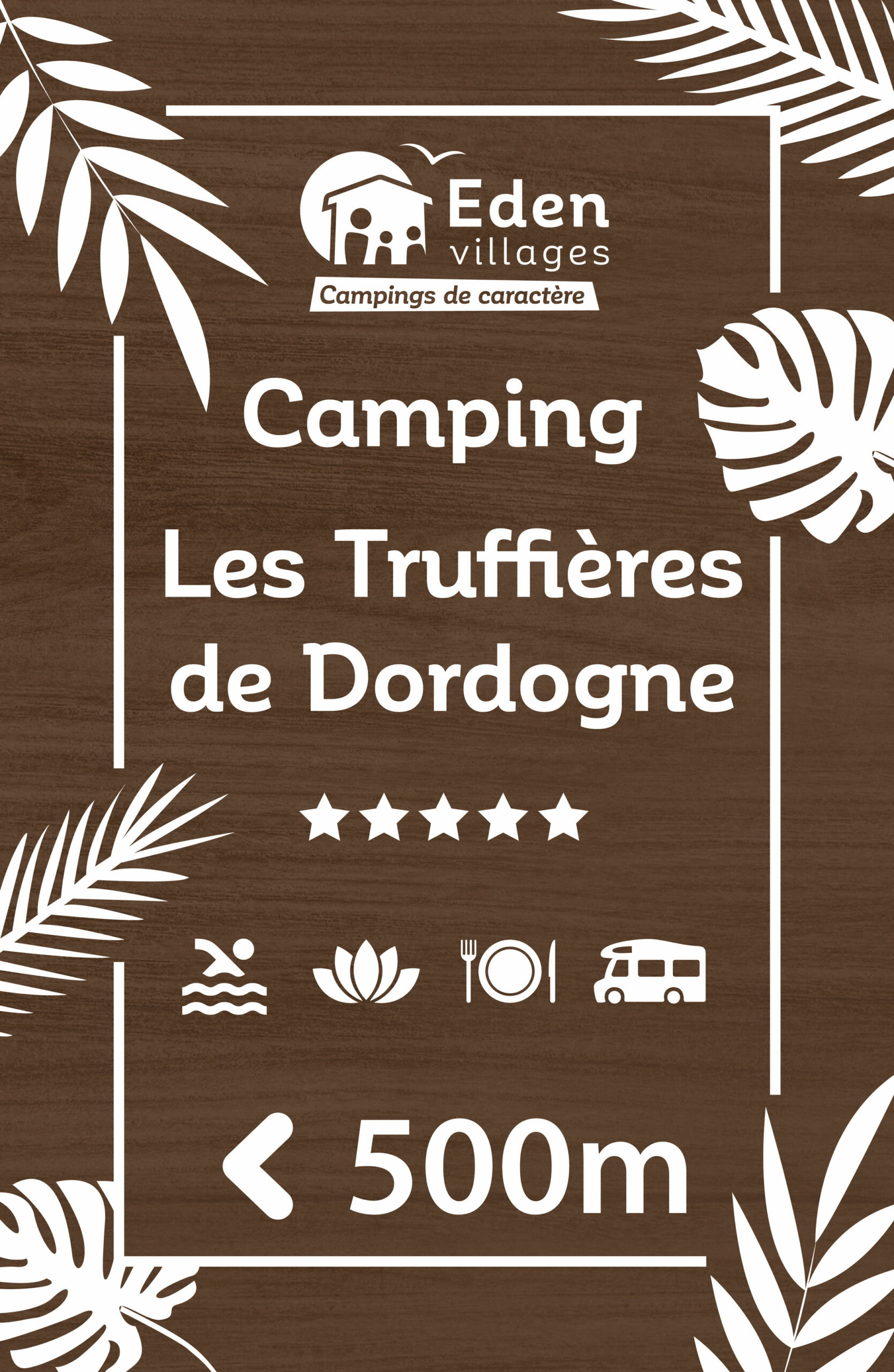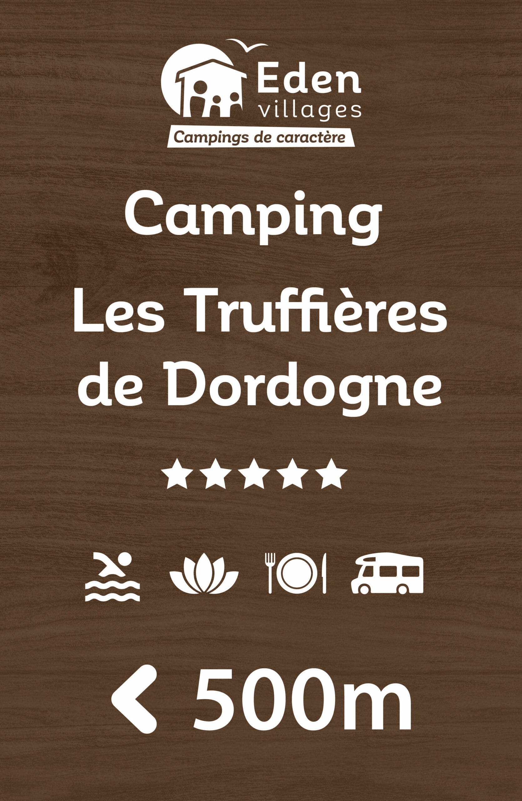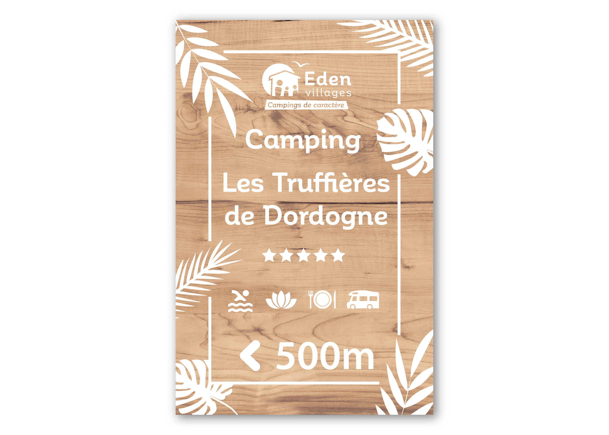 Panneau « Totem bord de route » RECTO, affichant le nom du camping, des pictogrammes illustrant les services proposés, ainsi que la distance jusqu’au camping.