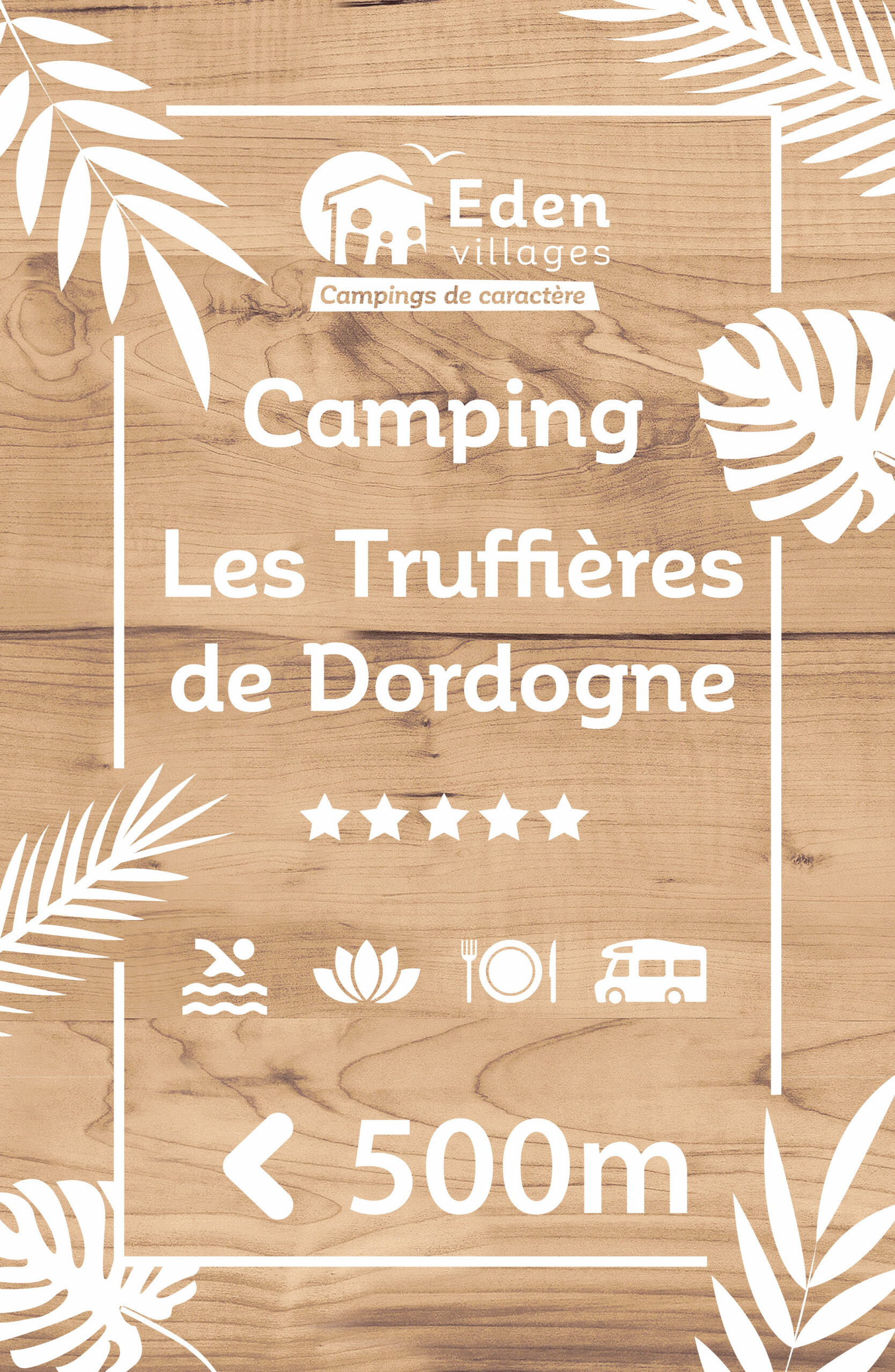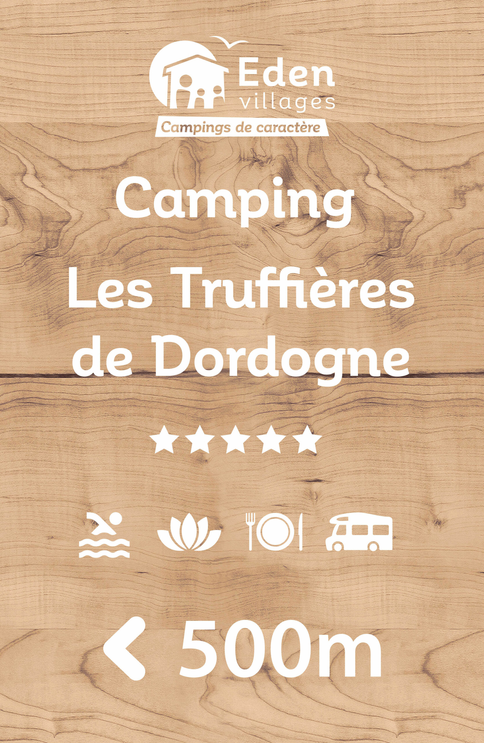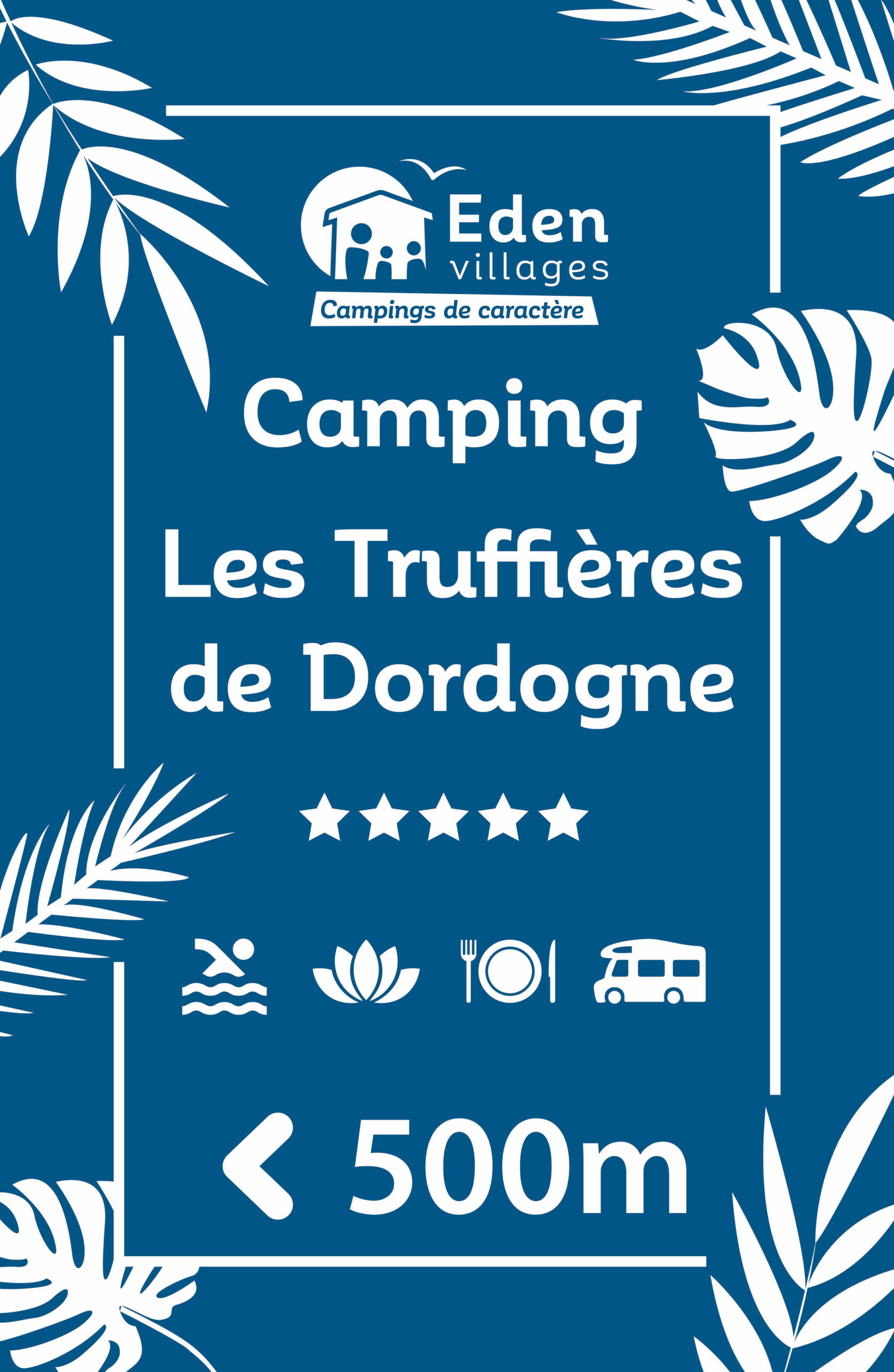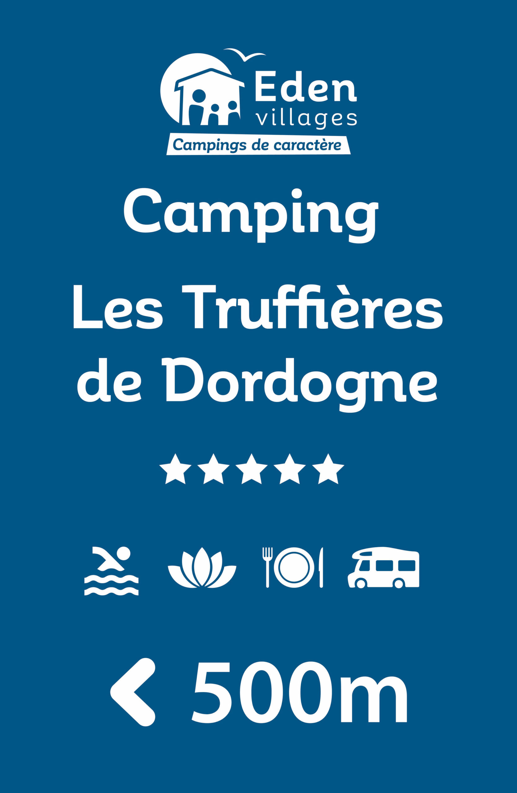 Panneau « Totem bord de route » RECTO, affichant le nom du camping, des pictogrammes illustrant les services proposés, ainsi que la distance jusqu’au camping.