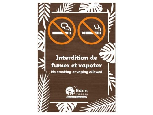 20x30 cm Panneau « Interdiction de fumer et vapoter », avec deux pictogrammes (cigarette et vapoteuse barrées). Disponible en trois coloris : bleu, bois clair et bois foncé, avec une déclinaison fleurs pour chaque version.