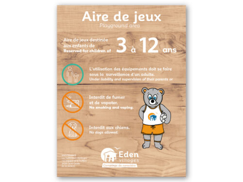 60x80 cm Panneau « Aire de jeux », avec conditions d'utilisations. Disponible en trois coloris : bleu, bois clair et bois foncé, avec une déclinaison fleurs pour chaque version.