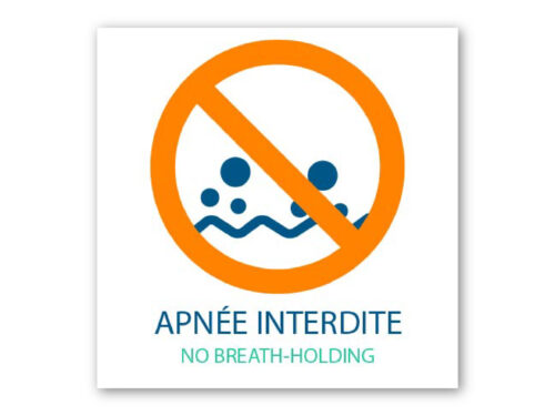 20x20 cm Panneau "Apnée interdite", indiquant l’interdiction de faire de l’apnée dans les zones de baignade concernées. Disponible en deux coloris : bleu et blanc.