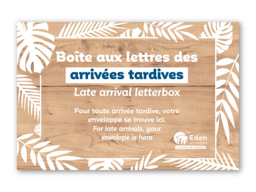 30x20 cm Panneau "arrivées tardives", indiquant l’endroit où récupérer son enveloppe en cas d’arrivée après les heures d’ouverture. Disponible en trois coloris : bleu, bois clair et bois foncé, avec une déclinaison fleurs pour chaque version.