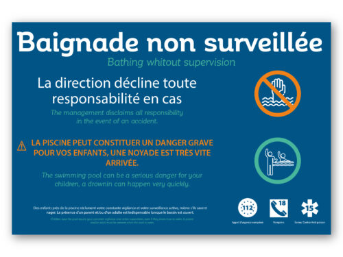 60x40 cm Panneau « Baignade non surveillée », rappelant l’absence de surveillance et la responsabilité parentale autour de la piscine. Disponible en bleu.