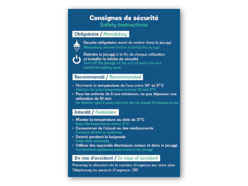 20x30 cm Panneau « Guide d'utilisation jacuzzi », détaillant les instructions d’utilisation étape par étape du jacuzzi et les règles de bon usage. Disponible uniquement en bleu.