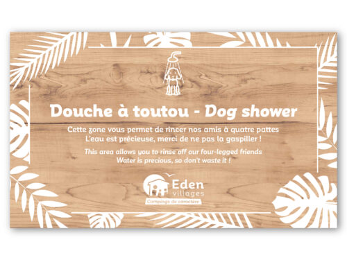 50x30 cm Panneau "Douche à toutou", indique la zone prévue pour rincer les chiens, tout en rappelant l’importance de préserver l’eau. Disponible en trois coloris : bleu, bois clair et bois foncé, avec une déclinaison fleurs pour chaque version.