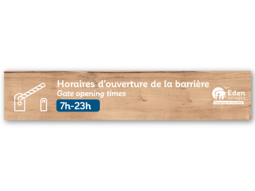 100x20 cm Panneau « horaires barrières », qui indique les heures d’ouverture de la barrière. Disponible en trois coloris : bleu, bois clair et bois foncé, avec une déclinaison fleurs pour chaque version.