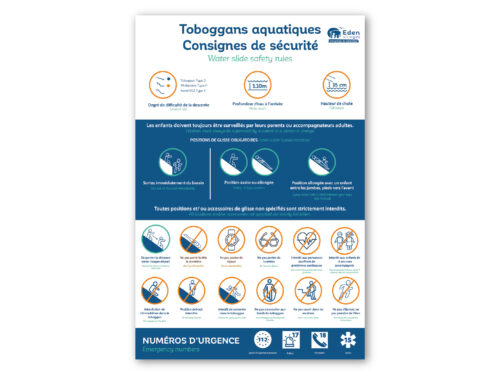 75x100 cm Panneau « Consignes de sécurité toboggans aquatique » présentant les règles de sécurité à respecter lors de l’utilisation des toboggans Disponible en blanc.